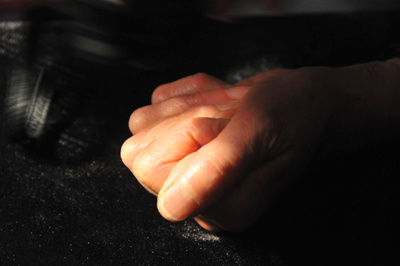 Ce n’est pas une performance habituelle, puisque l’artiste n’est pas le centre du film, ce sont des inconnus invités ; on ne voit pas leur visage mais une main et une seule. Elle dit la personnalité ; les voyantes en font même un commerce très lucratif ! Les mains peuvent tout dire de l’individu, disent aussi les scientifiques (les empreintes) ainsi d’ailleurs que les personnes amoureuses…