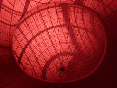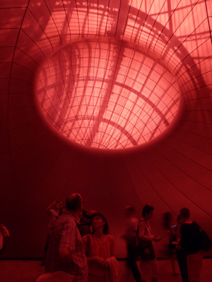 La toile a été minutieusement conçue par des équipes d’ingénieurs, elle est translucide, rouge sang, on dira peut-être plus tard « rouge Kapoor » comme on dit « bleu Klein » ou « verre Grand Palais ». Ce monochrome change de tonalité à l’intérieur du fait de la forme et des jeux de lumière provenant de la voûte du Grand Palais. Il évolue bien sûr dans le cours de la journée, mais l’expérience vécue est toujours aussi forte.