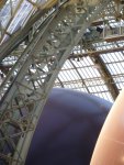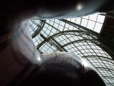 Tout part donc du ventre de la baleine qui nous donne, c’est selon, le sentiment apaisant du bienheureux baignant dans une lumière intra-utérine, ou une sensation d’étouffement, d’écrasement malgré l’élévation immense renforcée par les vertèbres de la verrière en ombres chinoises. Les voix de la foule s’apaisent, il y a comme un recueillement, on ne comprend pas tout, mais on saisit instantanément pourtant au fond de soi ce que ce lieu réveille. Est-ce la légère sur-pression ou le mélange d’hélium on se sent euphorique ou repoussé vers l’extérieur comme enfanté par le monstre.