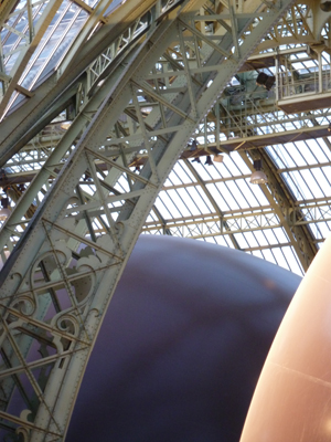 Le lieu a une importance fondamentale. C’est plus qu’un cadre ou un contenant. Il réactive certaines questions de sens induites par l’œuvre, par exemple le rapport dedans-dehors d’une œuvre. Les fers de la verrière se projettent à l’intérieur de Léviathan et se conjuguent ainsi avec les lames de la structure gonflable. Vus de l’intérieur, métal et matière organique du tissu se répondent et s’interpénètrent en vibrant sous la lumière. Vue de l’extérieur, la structure offre une confrontation entre la transparence de la verrière et l’opaque de la toile. La technique mobilisée par Anish Kapoor change les questions de perception selon la position du spectateur, ce qui n’est pas fortuit, mais relève d’un questionnement permanent de l’artiste sur le regard.
