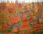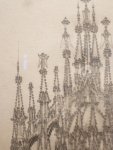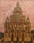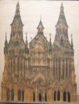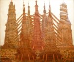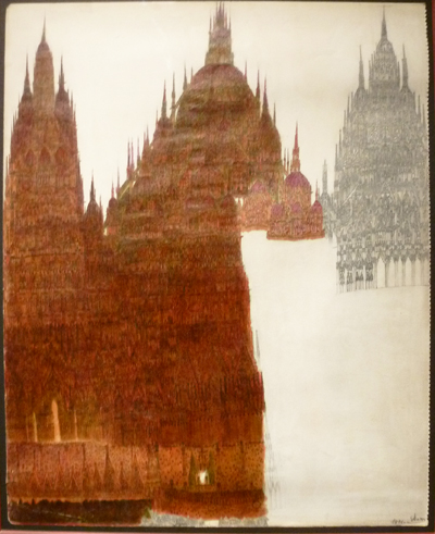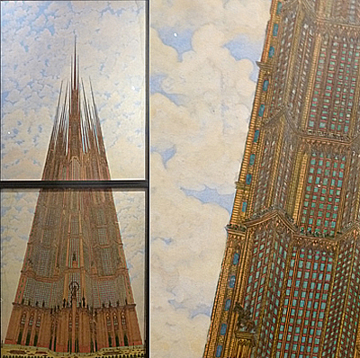 Un summum est atteint, pourrait-on dire, avec ses sept grands cartons de 1 m sur 0, 8 qui forment les pièces de triptyques de gigantesques édifices publics qui nous mettent dans la même situation d’écrasement qu’avec les tours staliniennes de Moscou. Sa manière de créer la perspective traduit sans nul doute quelque chose de très profond, une recherche de l’élévation de l’esprit. Le ciel prend de l’ampleur avec des nuages sortis de tableaux impressionnistes tandis qu’en bas de minuscules voitures circulent apparemment lentement ; sur les trottoirs, des hommes de la taille des fourmis. Il y a de l’Auguste Perret, l’architecte des tours d’Amiens et de l’église Saint Joseph du Havre, avec les pavés de verre. Ses dessins précèdent aussi les bandes dessinées du Schuiten d’Urbicande ou des Cités obscures. Des bâtiments démesurés soulignant la force du génie humain qui les a conçus, des machines à vivre idéales, issues des utopies du mouvement moderne.