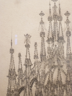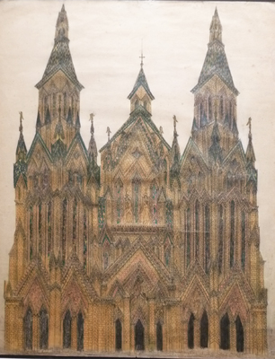 Cette exposition très aérée se compose de quatre parties thématiques et chronologiques. Des dessins de façades d’église, sagement dessinées (1930-1950), des cathédrales imaginaires débordantes aux tours saturées de détails architecturaux ainsi que de grands polyptyques (1950-1965), enfin des mégalopoles fantastiques colorées (1965-1975). Les formats sont généralement petits (70- 80) de la taille des faces de carton d’emballage, parfois plus grands afin de réaliser des polyptyques de 2 ou 3 m de haut, parfois encore des feuilles Canson.