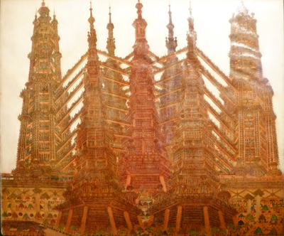 Les tours et les mégalopoles ? Serait-ce des images vues dans L’Illustration, où l’on trouvait des reportages sr Angkor, New-York, la Sagrada Familia, Notre Dame de Paris ? Viendraient-elles de cette seule source de culture qu’était pour lui la télévision, cette lucarne sur le monde ? Serait-ce cette vision de la modernité laissée par la construction des tours de la Défense ? Serait-ce aussi une angoisse dans le climat de guerre froide « Quand Paris sera détruit par la bombe atomique, le président des États-Unis viendra me voir et on pourra tout reconstruire avec mes dessins » ? La grande tour centrale représentait un abri anti atomique, dira-t-il à un médecin.