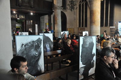 Il y a du compulsif chez ce peintre totalement travaillé de sa passion à rendre hommage et se mesurer pareillement à son mentor. C’est ainsi que la sacristie avec ses relevés d’inventaires, le chœur avec une immense fresque de fortes interprétations de tableaux religieux, des tableaux d’animaux sauvages sur les bancs au milieu des visiteurs, tout était empreint de Nicot. Un concert, où les musiciens se relayaient toute la nuit, célébrait une sorte de vision de l’artiste.