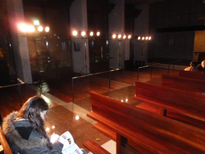 Pour cette nuit, YanVanderme avait proposé une installation minimale gardant en place presque tout le mobilier : devant les baies occultées, une série de projecteurs dirigés vers les bancs, et non des chaises, donc vers les visages des promeneurs d’un soir. La lumière blanche et froide était variable, la puissance étant proportionnelle au nombre de personnes présentes. L’ambiance généralement chaleureuse de cette petite église contemporaine en brique était ici transmuée en celle des catacombes lorsqu’il n’y avait que deux ou trois visiteurs. Les spots niaient l’architecture, le passant pouvait avoir le sentiment d’avoir fait le tour de l’œuvre en un rien de temps et n’avait qu’une hâte, partir, ce qui est paradoxal pour un lieu d’église.