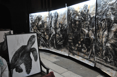 Une mise en scène exceptionnelle qui faisait voir l’église et son volume ; un peu comme celle de Christian Boltanski qui dans « Personnes » avec ses carroyages de vêtements au sol dialoguait en 2010 avec la voûte du Grand Palais.