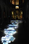 L’église Saint-Séverin de taille moyenne était portes ouvertes et dégagée de ses chaises. Dans la partie centrale de la nef, à 40 cm du sol, « planait » un pavage lumineux axial aux limites irrégulières Quelques mètres avant l’autel, il s’évasait de manière à dessiner un T, une croix primitive en tau.