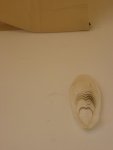 L’installation épurée attire le regard. Tout l’espace est bien organisé, chaque chose semble occuper une juste place et équilibre les autres : les murs sont blancs, les deux trames de tissu aussi, à leur pied un livre rouge fermé dont l’auteur serait l’artiste, une coquille (et il y en a deux autres, paraît-il, derrière les trames). Les trames sont verticales, tels des humains, et, à la place de la tête, une sorte de froissement du tissu ou une étrange souillure. Rien n’est évident et tout semble lié à un sens caché. L’émotion est contenue, d’où vient-elle ?