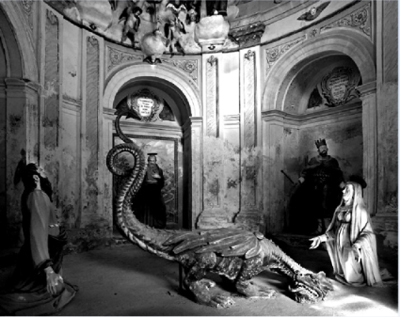 La symbolique et l’imaginaire. Un dragon entre Joseph et Marie ? Une bête de manga japonaise égarée en Italie ? Cette scène est une référence à l’Apocalypse où il est question d’une femme resplendissante qui enfante dans la douleur et qui est traquée par un dragon monstrueux (Ap 12,1). Or rien dans l’évangile ne dit que l’accouchement fut douloureux. Comme il fallait distiller une certaine dose de souffrance, à l’image des scènes de crucifixion, les sculpteurs italiens ont placé cet être imaginaire qui, pour nous, contemporains, résonne d’une toute autre manière. On pourra noter avec intérêt que Saint-Merry possède dans sa nef une frise où dragons, salamandres, bœufs ailés ont été sculptés dans la pierre à la même époque que les « Sacri Monti ». À l’occasion de l’exposition d’été 2012, Saint-Merry avait accroché une grande chimère dans sa nef pour traduire dans des termes contemporains ce qui se pensait au XVIe. La bête extraordinaire a donc bien sa place dans les églises ; elle exprime à la fois la liberté imaginative permanente des artistes et leur souci de s’inscrire en référence à des œuvres ou textes passés.