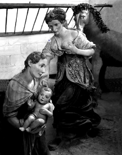 La scène où une femme, probablement une nourrice montrant son sein nu vient en aide à Marie pour l’allaitement, pourrait avoir inspiré les grandes photographes contemporaines de la condition féminine, comme Cindy Sherman ou Orlan, qui se sont représentées en sainte (« Sainte Orlan » dans les années 80) en dévoilant un seul sein, mêlant érotisme et questions spirituelles. C’est dire si la multiplicité des scènes saisies par Pier Ilario Benedetto est riche en associations possibles avec l’approche contemporaine en art, même si le photographe n’affiche aucune intention de ce type.