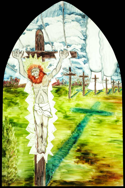 C’est dans cette même veine de l’affirmation de la vérité de l’artiste rencontrant un public jugeant justes et fondées les interprétations contemporaines des textes de la Révélation, c’est-à-dire leur actualisation pour notre époque , que l’on peut interpréter la vidéo récente projetée sur vitrail à Saint-Merry par Camille Goujon, Cruci Fiction (Voir vidéo et article) : un baptême de Jésus par Jean-Baptiste qui se termine en douche et une crucifixion, marquée par une électrocution au temps de notre questionnement sur le nucléaire, deux ans après Fukushima, une sorte de fin des temps pour une région japonaise. Il n’y eut aucune réaction et aucun remous, alors que tous les ingrédients étaient réunis pour provoquer le scandale : le vitrail, lieu de la transmission de la lumière venant de l’extérieur, la symbolique du message divin ; la vidéo humoristique au bord du cocasse, alors que tout ce qui est évoqué est bien sérieux ; l’interprétation par une jeune artiste que l’on ne peut pas classer comme plasticienne chrétienne. Mais tout était juste et revigorait notre regard (lire l’interprétation de cette œuvre par V&D).