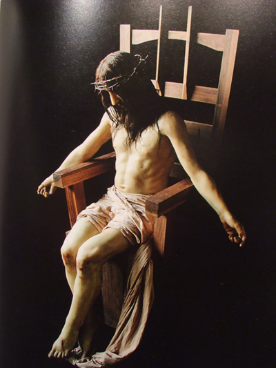 Qu’est-ce ? Une sculpture grandeur nature qui montre un Christ assis sur une chaise électrique, une contraction de deux formes de supplice sur 2000 ans. Une manière de sortir cet événement de la banalité et de son usure en termes d’image. Une œuvre violente qui pose la question du sens.