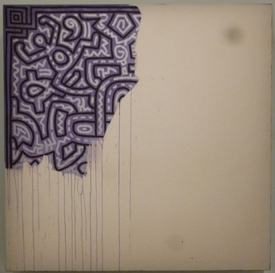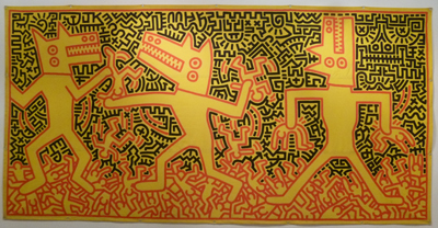 Très tôt, Keith Haring construit un style sur le principe d’un trait dessiné dans l’urgence, sans esquisse préalable ni remords, plusieurs tableaux pouvant être réalisés en même temps. Avec ses grands à-plats, une ligne simplifiée qui court et sur laquelle s’accroche de nombreux éléments, il emprunte aux symboles mayas et à son calendrier, aux références égyptiennes (figures de crocodiles, dessins de profils), mais aussi aux récits de science fiction (soucoupe volante) et bien sûr à la Bande Dessinée et ses story boards . En utilisant comme motifs des pictogrammes qui correspondent au degré minimal de l’expression et de la signification, il construit des récits visuels et des messages d’une grande densité. Ses tableaux sont saturés et excluent le vide, à la différence d’un Jean-Michel Basquiat. L’artiste traduit ainsi dans chaque œuvre son hyperactivité et son implication totale dans ses sujets. Si ces signes se retrouvent d’œuvre en œuvre, les couleurs et les agencements changent et développent sa pensée. Il est donc à la fois pop mais aussi post-moderne, dans sa pratique de la citation d’arts les plus divers. Les corps sont simplifiés à l’extrême et la psychologie s’exprime dans les signes/lignes : les trous dans les personnage, les bras en croix, les ciseaux, les crocodiles et les chiens menaçants, etc.