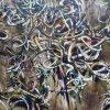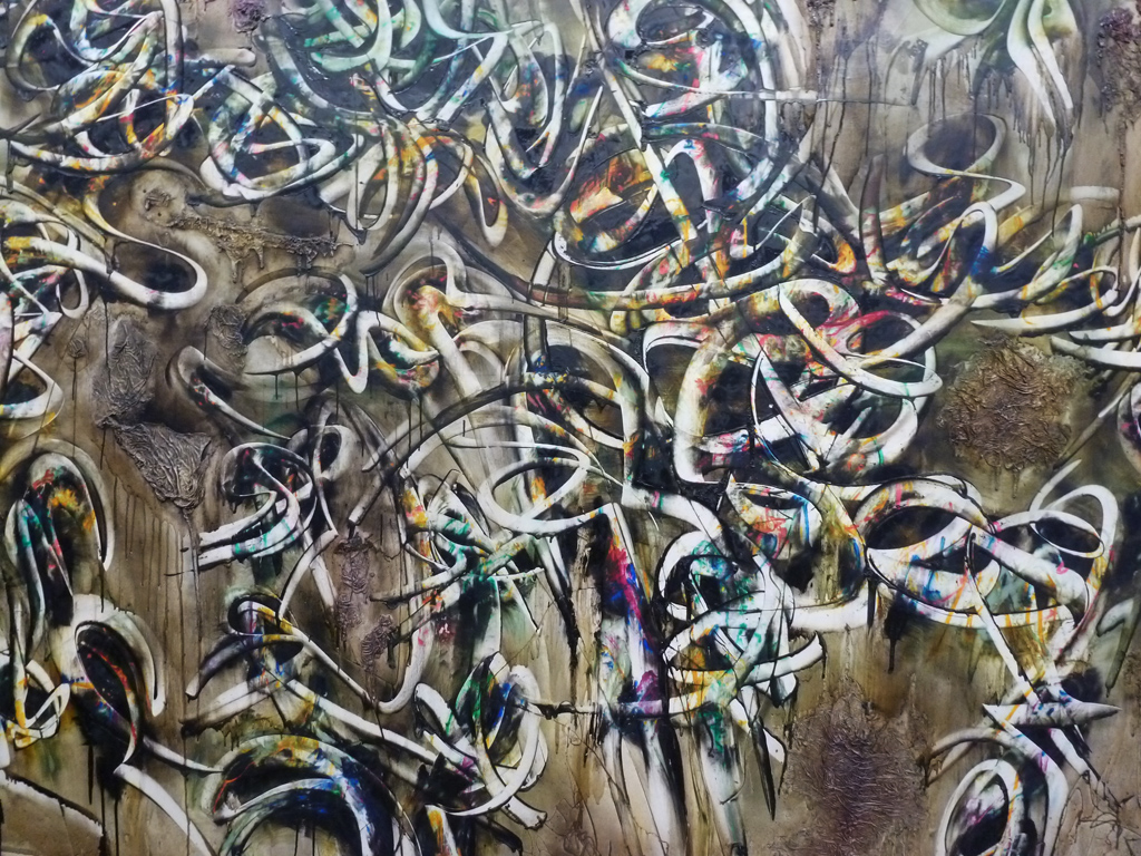Puis, influencé par Georges Mathieu mais surtout par Jackson Pollock, il entre dans une brève période gestuelle et il invente la technique des petites touches qui lui permettent d’occuper la totalité de la toile. « Sexe-Prime, Hommage à Jean-Pierre Brisset » (1955), une toile de 240x530 cm, montre à quel point il maîtrise les grandes dimensions.