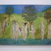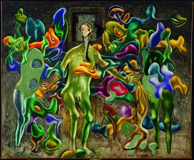 Marqué par le surréalisme en déclin et protégé par André Breton, Simon Hantaï rompt rapidement avec le mouvement, non sans avoir développé des techniques et des inspirations très personnelles : compartimentage des tableaux, ossements, collages, créatures hybrides et inquiétantes ; « Femelle-Miroir II » traduit la violence de ces inspirations.