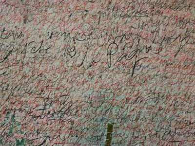 « Écriture rose » ressemble à une immense feuille sur laquelle il écrit chaque matin des textes de la Bible, mais aussi des textes philosophiques de Hegel, Heidegger, Augustin dans les quatre couleurs du temps liturgique. Pour délimiter et organiser l’espace, il y répartit des signes qui ont marqué son enfance : une croix grecque, l’étoile de David et l’encrier de Luther. L’écriture, dont les couches se superposent jusqu’à rendre illisibles les textes, devient la trame de la toile, le fond et le support de la peinture. Simon Hantaï invente ainsi une autre forme de dripping en l’associant au fond d’or des primitifs italiens.
