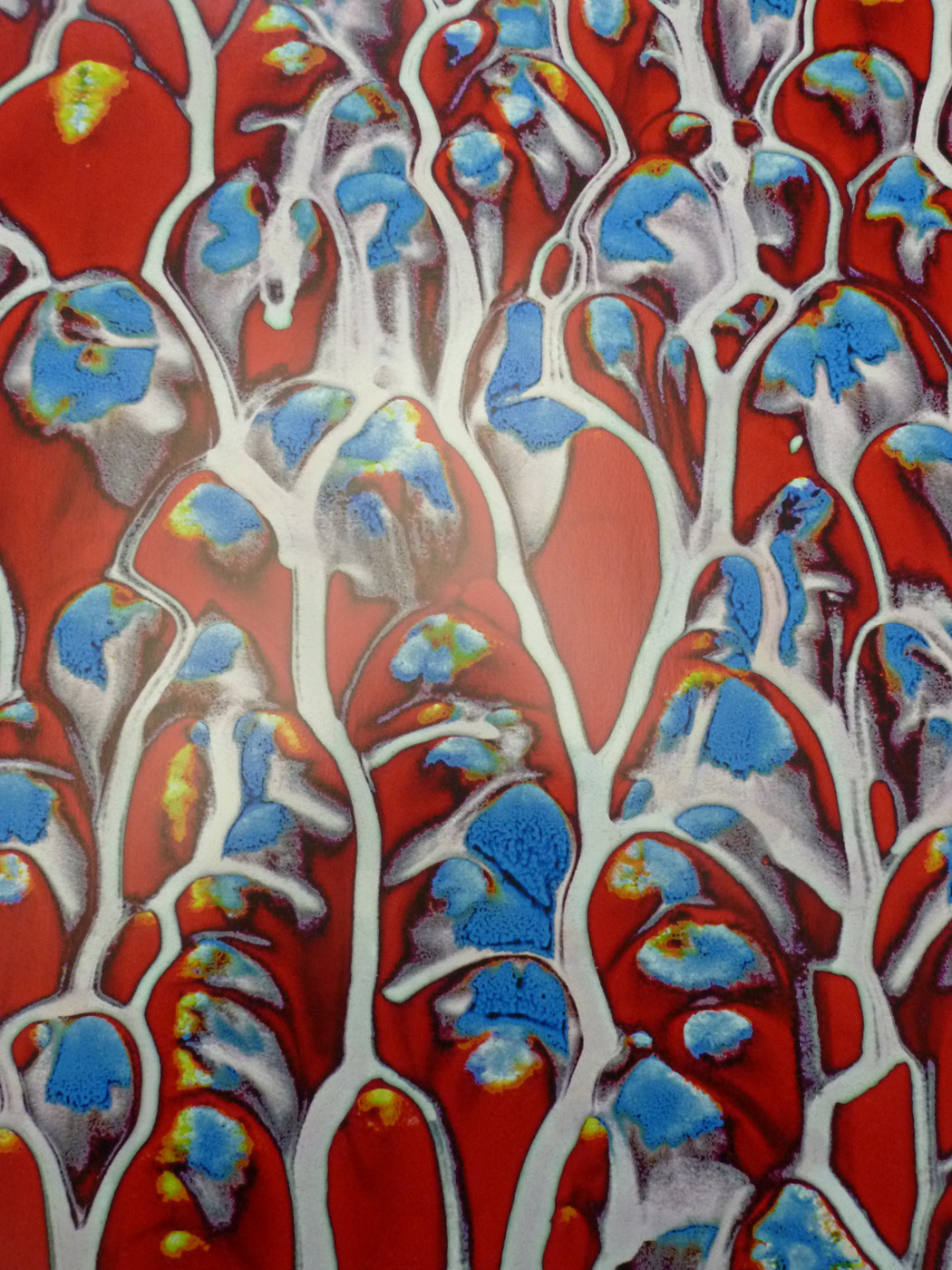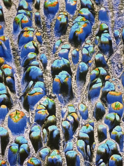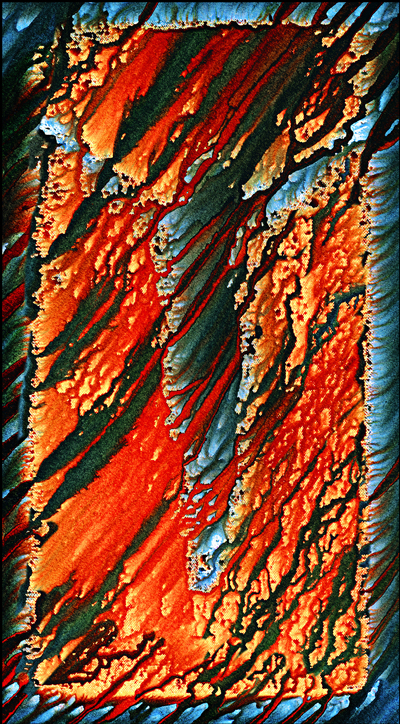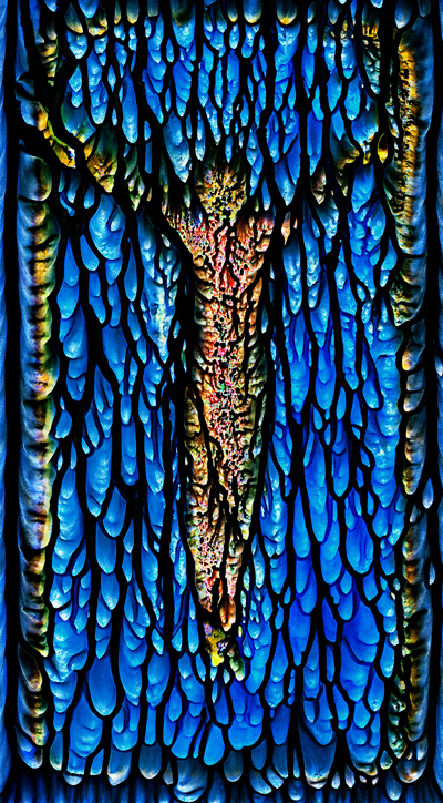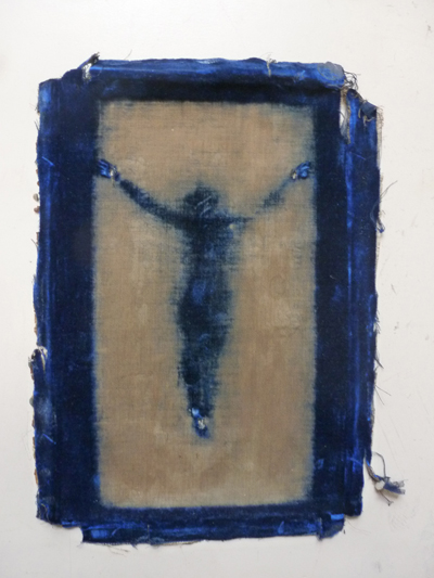 Le photographe comme alchimiste. En transformant une image initiale globalement pauvre, un bout de tissu dénaturé par l’exposition au jour et par les ans, en des images à la riche coloration, l’artiste est dans le registre de la transmutation, dans le passage d’une empreinte à une image, d’un matériau à un autre. En partant du tissu et des traces du crucifix, il crée des images oniriques qui tiennent autant du minéral que du végétal ou de l’aquatique. Mais ici pas de théorie ésotérique, seulement une pratique dont les résultats sont tirés sur toile. Les photographies originales, celles qui subsistent des essais successifs, celles où l’on voit distinctement pleurer l’encre sur les bords, sont restées dans le secret de l’atelier…