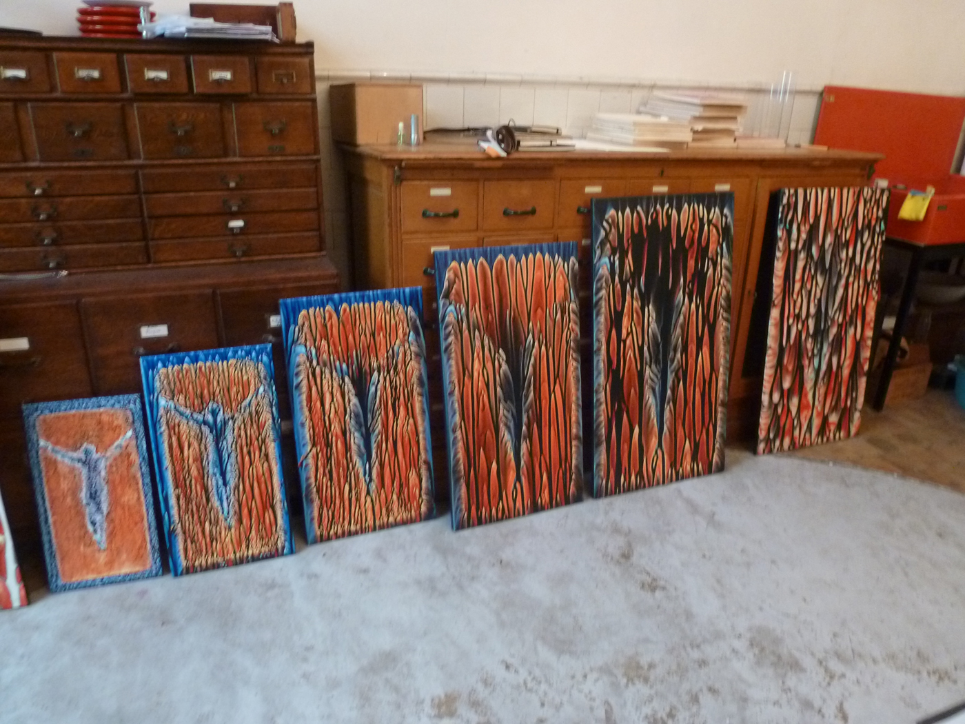 « Au commencement » et la suite. Cette œuvre a une genèse, l’artiste décrit lui-même sa propre recherche à partir d’un velours devenu bicolore comme une genèse aboutissant à un espace autre fait de formes et de couleurs. A cette occasion, il utilise les premiers mots de la Bible et de l’Évangile de Jean, il ne cache donc ni le registre, ni la posture d’où il parle. Il crée. Mais y-a-il un ordre, linéaire ou rationnel, après la photo du tissu ? Cette œuvre est-elle au service d’un discours ? « Passions » interroge la notion même de série en photographie, tant la diversité des éléments est grande et tant ces exercices de photos de photos, ou de choix des références de couleurs, déstabilisent toute analyse chronologique. Il y nécessairement de multiples ordres, celui du calendrier de la production de chaque photo, probablement perdu, celui proposé par l’artiste lors des accrochages dans chaque lieu, celui que va choisir le spectateur précipité dans la perte ! Mais, l’important est plutôt ailleurs : il y a une filiation de l’ensemble à partir d’un œuvre mère (ou père !) : un tissu ou plutôt l’absence d’un objet signifiée par ce tissu. Dans cette dialectique absence/présence, on est ici, à nouveau, aux confins d’une interprétation spirituelle.