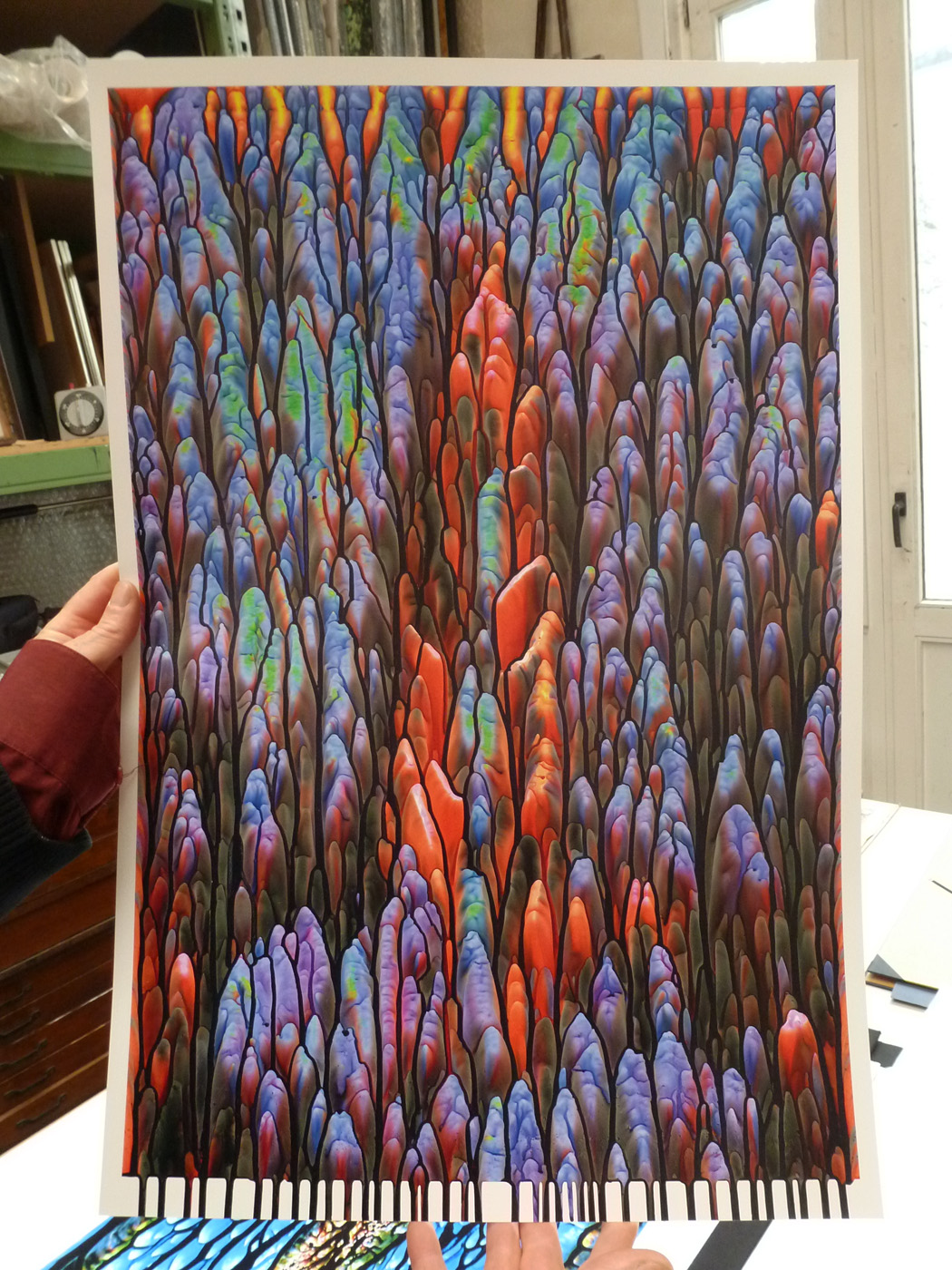 Cela consiste à altérer radicalement les paramètres individuels de chacune des sept encres de l’imprimante couleur de telle manière à ce que, durant le processus d’impression, les encres puissent couler librement mais de manière contrôlée sur la surface du papier.