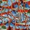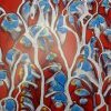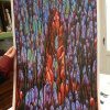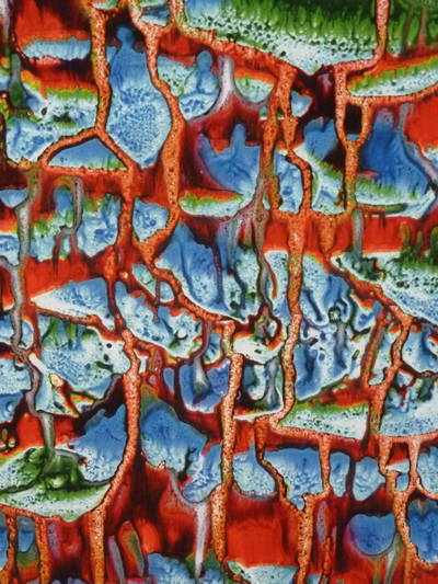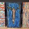 La perte et l’image. Quand on examine le petit tissu original, on imagine aisément la taille du crucifix manquant, une quinzaine de cm. Mais avec l’augmentation des dimensions des toiles, au-delà de un mètre, les repères se perdent, l’œil s’égare. Le choix des couleurs joue son rôle tout autant que le travail d’agrandissement. En passant de la trace, de l’ombre du crucifix perdu aux gouttes d’encre sur un détail, c’est-à-dire du réalisme à l’abstraction, le regard a l’impression de naviguer entre l’infiniment grand d’une galaxie colorée et l’infiniment petit des molécules. Le spectateur passe d’un univers à un autre et recherche des références dans sa propre culture pour donner son propre sens à l’œuvre, car celle-ci est fondamentalement intrigante. Dans cette expérience de la perte, voire du vide de la forme, le spectateur en appelle à trouver, à passer d’un monde du matériel à celui du symbolique et du spirituel.