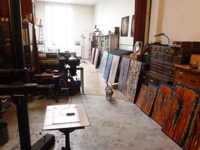 Une quête et des gestes en atelier. Stephen Sack aime chiner, notamment des objets à caractère religieux. Il aime ces traces du passé, ces choses matérielles oubliées ou mises de côté, sans avenir ; il en fait l’objet de méditations personnelles secrètes et le début de cheminements artistiques. Mais il est plus qu’un chineur, il est un découvreur dans le champ de la photographie, un expérimentateur, un artisan qui joue sur le temps : cette série est le résultat de deux ans de travail et certains des tirages ont pris huit heures de machine . Il faut être passionné pour réaliser un pareil ensemble ! Tout se passe dans son atelier, comme un peintre classique. Il n’est donc pas neutre que les photos aux coloris intacts soient, pour le public, tirées sur toile, en semi-mat, sans brillant factice.