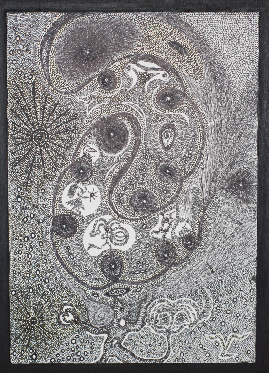 Il n’est pas un inconnu pour Saint-Merry puisqu’il y est déjà intervenu deux fois : la réalisation d’une crèche en coton-tiges et un séjour en résidence d’été qui s’est achevé par l’exposition d’un bateau de fil de cuivre, lors de la Nuit Blanche 2008. Il est aussi régulièrement présent dans certains évènements théâtraux organisés dans l’église. Autodidacte, il travaille depuis de longues années sur des dessins très personnels et intériorisés, réalisés au stylo à bille et au crayon ; un art brut qui n’est pas sans écho avec les expressions des artistes non occidentaux, aborigènes ou indiens aux cosmogonies les plus diverses. Dans cette traduction visuelle d’un cheminement intérieur, ses œuvres refètent l’imaginaire à l’aide d’un langage dont on n’a pas les références, un langage unique, le sien.