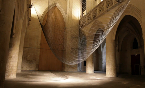 Pour Saint-Merry, l’artiste reprendra une sculpture faite de cordes, 200 à 300 fils, reliées à des moteurs latéraux pour produire une lente rotation, le ballet d’une sorte de filet induit par la gravitation, symétrique de la voûte, qui frémira aux éclats du soleil passant par les vitraux souvent translucides de la nef. L’artiste est aussi un compositeur qui a écrit une musique minimale construite sur les quatre notes de l’hymne de Saint-Jean-Baptiste, base du solfège médiéval. Ce projet, déjà monté dans une chapelle de Caen, nécessite des moyens logistiques et financiers importants qui restent à trouver. Il s’agit de proposer une halte de repos méditative à tous les touristes qui vont en pèlerinage à Beaubourg durant l’été.