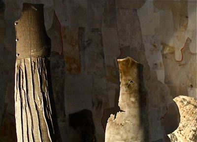 « Je marche sur le rivage. J’arpente les grèves. Ma collecte : des tissus échoués, chiffons abandonnés par la mer dans le sable, fragments de mémoire, vêtements élimés venus du large, vestiges d’un monde flottant. Par le jeu des métamorphoses, je redonne corps à des matières désaffectées, issues du rebut du monde, épuisées, grignotées. Je découds, recolle, assemble les fragments. J’interroge les lignes, les tâches, les accidents. Je tente de reconstituer les bribes d’une histoire décousue. »