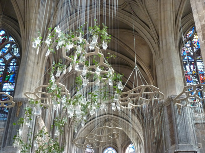 Pour voir la lumière passer, il faut l’arrêter ! Dans les églises, les vitraux ont cette fonction, mais il est d’autres moyens créés volontairement ou fortuitement par les artistes. Ainsi, au lendemain 2013 de la Nuit Blanche de Saint-Merry, l’œuvre de Pascale Peyret a changé complètement de visage lorsque les centaines de fils de nylon reliant des socles aériens à des poches de tradescantia se sont mis à vibrer sous le soleil.