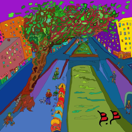• [**Bertrand Barachin*] dessine sur ordinateur des personnages déformés, des univers urbains colorés et soulevés par le vent, des réinterprétations d’œuvres ayant comme thème le travail qu’il a vues au BIT de Genève ; tout est ensuite contrecollé sur bois.