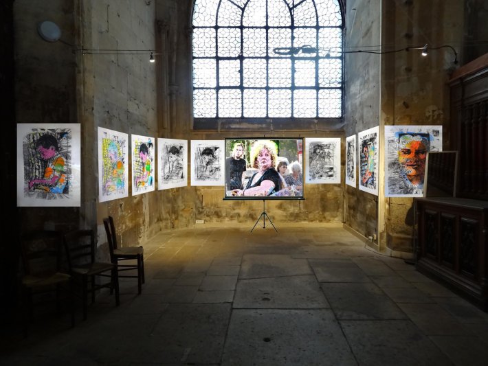 Deux artistes, l’un avec une œuvre en mouvement, pour révéler la voûte de l’église par la lumière et l’autre, pour explorer les confins d’un univers mental.