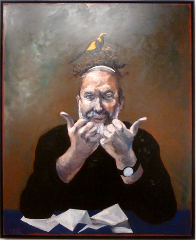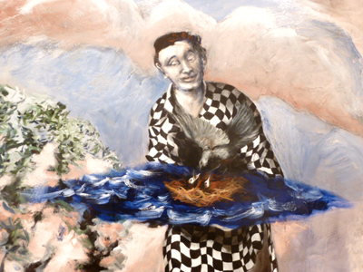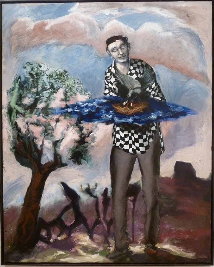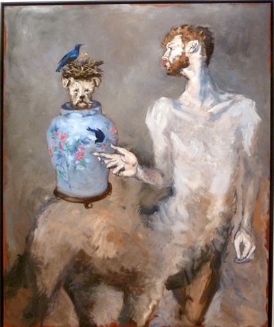 En multipliant les positions du nid dans ses tableaux, Gérard Garouste se fait visuellement cocasse et imaginatif pour traiter de questions de sens, ce qui est dans la logique même du Talmud. « Le Rabbin et le nid d’oiseau » est un vibrant hommage à Marc-Alain Ouaknin, jusque dans les gestes de la main très mobile, caractéristique des commentateurs. Avec « Le Centaure et le nid d’oiseau », il s’amuse à construire une situation saugrenue, mélangeant tous les registres de sa vie : le centaure, hybride de l’homme et du cheval, alliance de la force fougueuse et du rationnel, est un thème auquel beaucoup d’artistes, comme lui, sont sensibles ; un pot, celui du Lotus Bleu, de Hergé, d’où émerge le chien de l’artiste qui ici a les traits de Milou ; au-dessus, le nid d’oiseau. Une création de pure jouissance visuelle, dans laquelle s’articulent différents éléments mythologiques et des morceaux de sa vie, comme dans un rêve. Ici les logiques phonétiques de l’exercice biblique sont remplacées par la liberté des articulations visuelles.