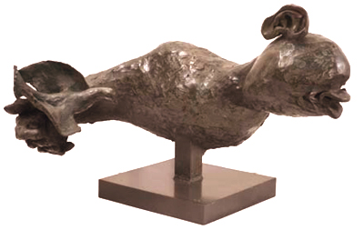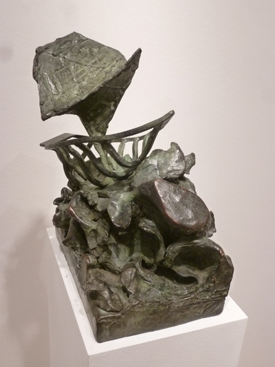 Si la peinture de Gérard Garouste est nourrie de la méthode talmudique appliquée à la pensée visuelle et, somme toute, analogique à la pratique de la parole en situation psychanalytique, il en va aussi de ses bronzes, notamment de deux dont le sujet est l’histoire de Jonas. Tout aussi déformées que ses corps, ces petites sculptures aux multiples détails font émerger des excroissances ou associent des morceaux de matière qui laissent passer la lumière : tout y est symboliquement fort.