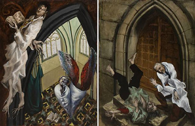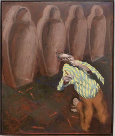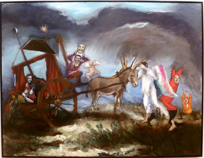Dans son tableau précédemment exposé « Isaïe d’Issenheim » (2007), Gérard Garouste dénonçait avec colère ce qu’il appelle le scandale d’une éducation qui l’aurait dupée. Il s’y représentait en camisole de fou, bâillonné dans une église, face à un Isaïe, provenant du fameux retable de Grünewald, peint dans une arcade avec des pieds en racines. L’objet du message était double : le christianisme assumait une dette en héritage, mais aussi la niait en se l’appropriant.