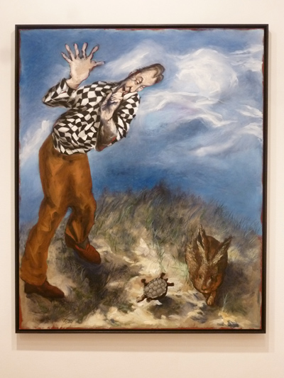 L’autoportrait de l’artiste dans une case redessinée des « Cigares du Pharaon » ou l’illustration déformée du « Lièvre et la tortue » ne signifient pas que la Galerie Templon cède à une mode postmoderne. On accède à cette exposition « comme dans un rêve », pour reprendre un commentaire de Gérard Garouste, et le regard glissant d’œuvre en œuvre saisit bien l’inspiration flottante qui est à l’origine. Mais l’usage des personnages de fables et contes relève de la méthode, car l’essentiel se trouve dans les questions sous-jacentes : Qu’est-ce qu’interpréter ? Pourquoi et comment le faire dans le champ des arts visuels ? En quoi une telle question a à voir avec notre époque moderne arcboutée sur ses certitudes techniques ?