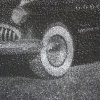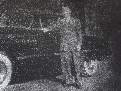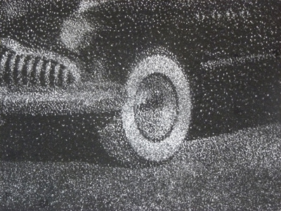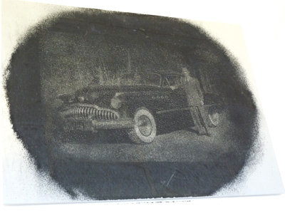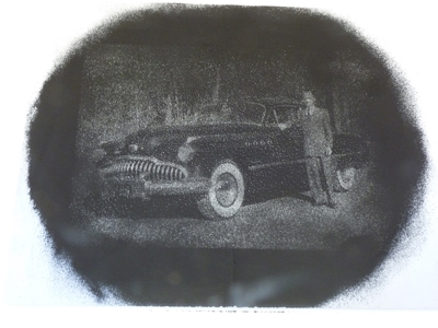 Le sujet est une photo ancienne, un souvenir familial que l’artiste rend public. Un homme fier de lui et de sa voiture, dans les années 50. Le sujet est quelconque mais traité à la manière d’un portrait où tout est sensé exprimer un caractère, une réussite sociale. Mais l’homme est mort. Ce n’est pas une photo d’époque mais une interprétation de celle-ci et un témoignage flouté. L’artiste rend compte d’un événement ou plutôt de la relation à son grand-père. On est bien dans le domaine de l’écriture, sur le mode visuel avec des matériaux spécifiques, d’une expérience qui a compté pour l’artiste. L’allégorie avec les premiers récits de la Résurrection peut être poursuivie.