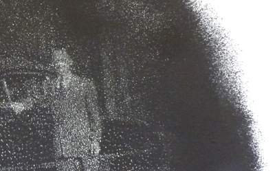 L’œuvre est splendidement mise en scène. Ainsi, la vitrine de la galerie applique en miniature la théorie du cube blanc utilisée souvent par les grandes galeries : ne pas troubler le regard du spectateur par l’environnement, le concentrer sur l’œuvre. Le regard « tombe » sur cette petite œuvre inclinée dont on ne réalise pas immédiatement la fragilité extrême. Si l’on devait revenir une semaine plus tard, sans nul doute les deux poudres, blanche et noire, le talc et le noir d’ivoire, auraient glissé et se seraient mélangées, diminuant ainsi la précision de l’image, entre flou, pixellisation et décoloration naturelle. C’est bien une image de la décomposition des corps que l’on a, une allégorie de la mise au tombeau.