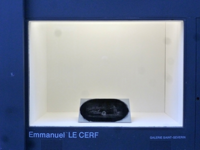 « Pour la Galerie Saint-Séverin, Emmanuel Le Cerf réalise une œuvre inédite : une installation révélant une image personnelle, celle de son grand-père parti travailler en Amérique posant fièrement devant sa voiture, et éphémère car composée de talc et de noir d’ivoire. La photo de l’album de famille a été pixélisée puis reproduite sur une trame en papier, sorte de tamis permettant cette recomposition de la photographie en poussière (blanche sur noire). La fragilité de l’image est renforcée par sa position sur un socle incliné, vraie mise en danger dans la vitrine.
