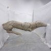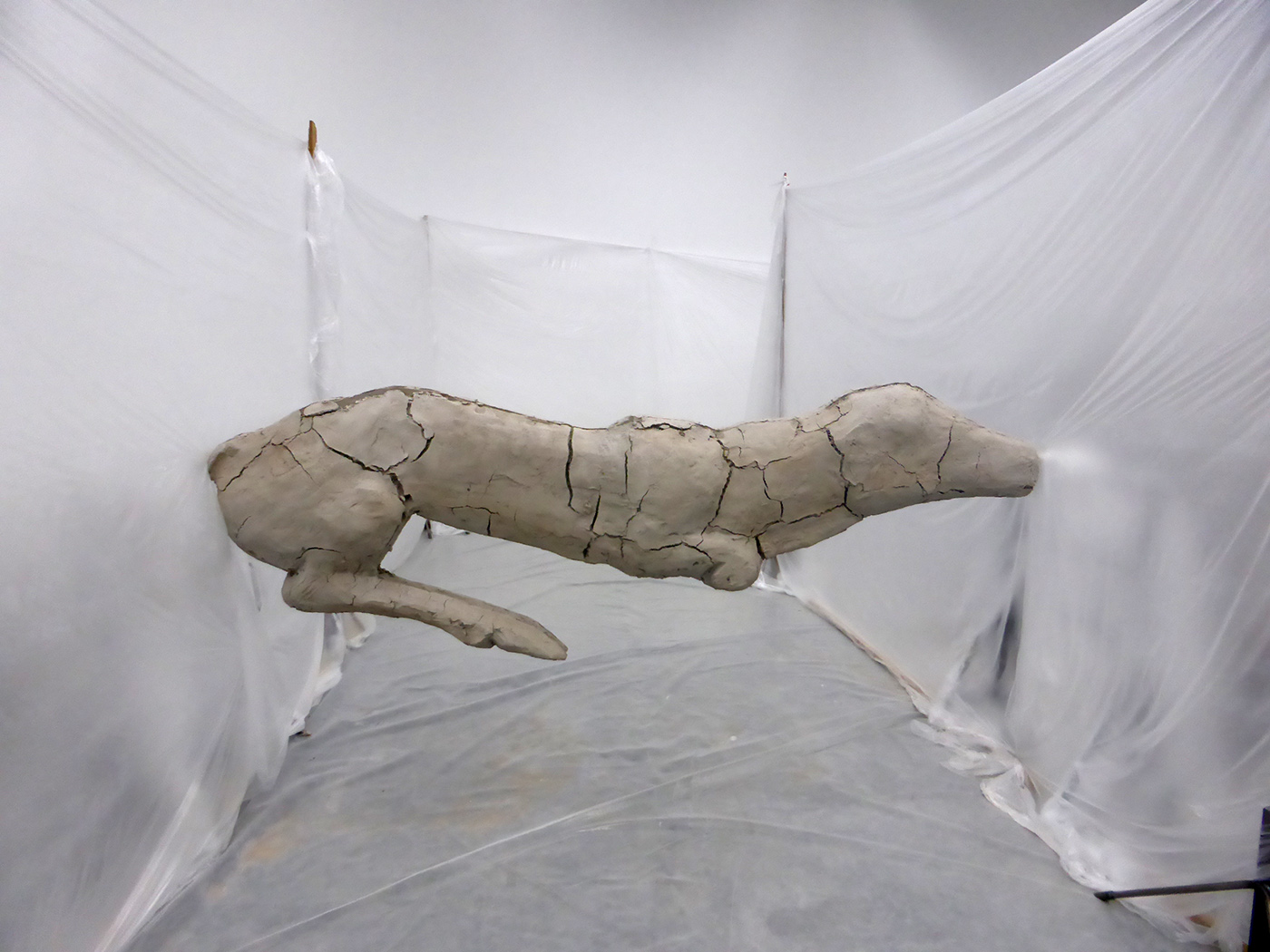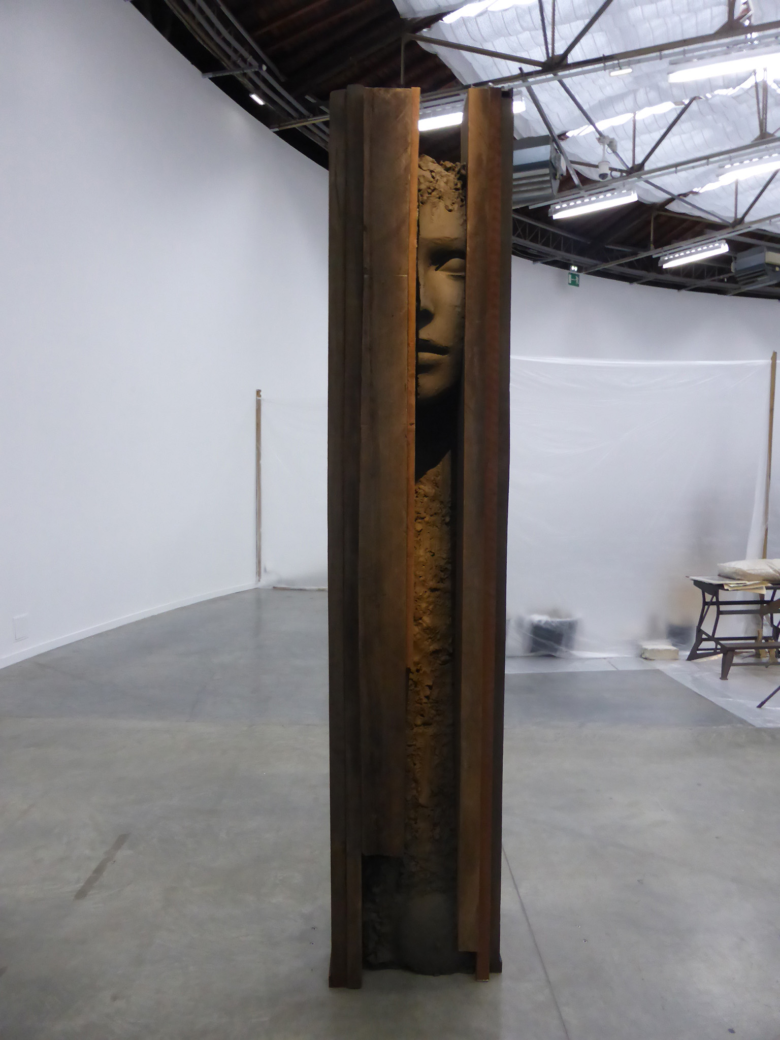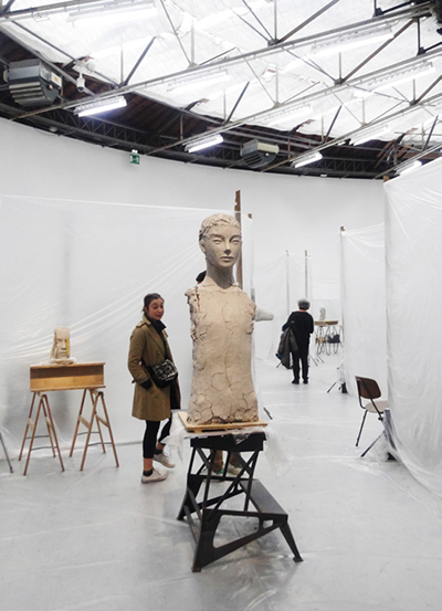 Puis le faux semblant d’un atelier évoqué par des bâches transparentes : des statues en cours d’élaboration semblent d’argile mais sont en bronze (M. Manders).