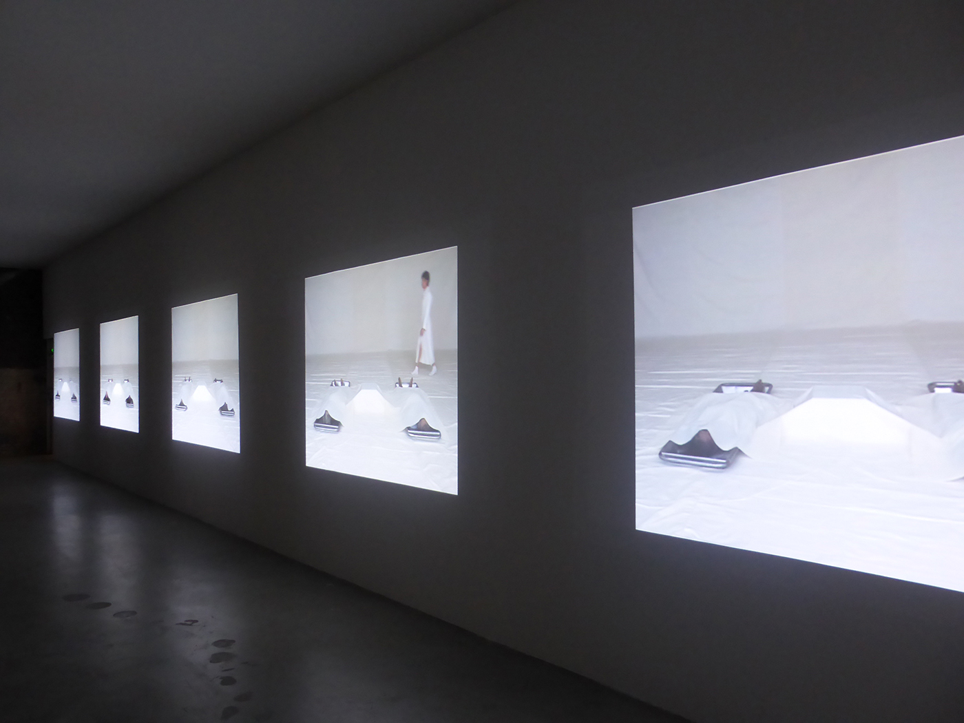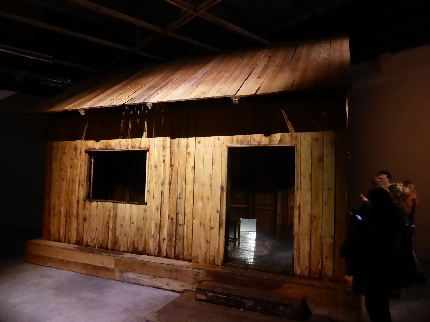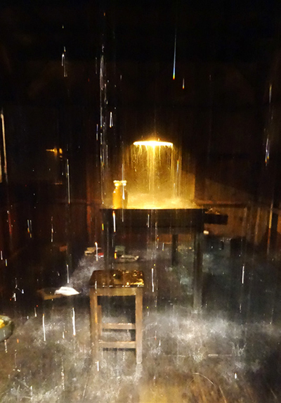 Au lieu d’être le refuge accueillant qu’elle devrait être, une cabane en bois est le siège d’une mousson. C’est donc à l’extérieur qu’il faut s’abriter (S. Thidet). « L’homme qui tousse » est un mini-film en boucle difficile à supporter : assis sur le sol d’une pièce nue, un homme flou suffoque et crache, plaçant le spectateur dans une vision douloureuse (C. Boltanski).