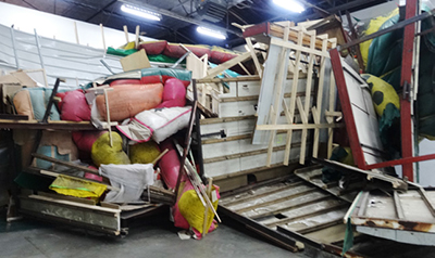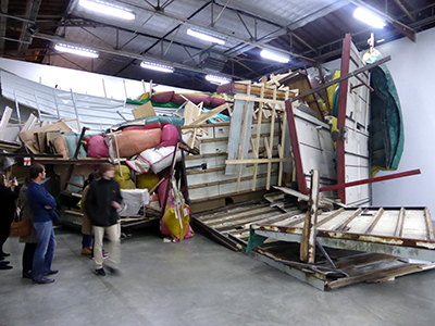 Plus loin, on chemine au milieu d’une accumulation impressionnante de décombres, savamment échafaudée, suggèrant le chaos, la dégradation boursouflée, peut-être la catastrophe (P. Buggenhout).