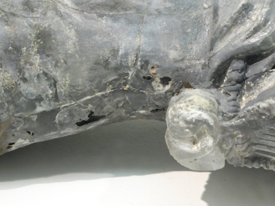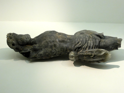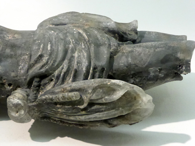 Quand on est face à la vitrine de la galerie Saint-Séverin, on est intrigué par la forme exposée, un morceau reconnaissable de statue de Christ gisant au sol. La couleur est inhabituelle, grise, et partiellement translucide ; le matériau est étrange, on l’identifie progressivement comme étant du verre et non du marbre. Le titre, Cristallisation, renvoie à la fabrication de l’objet que le cartel décrit ainsi :