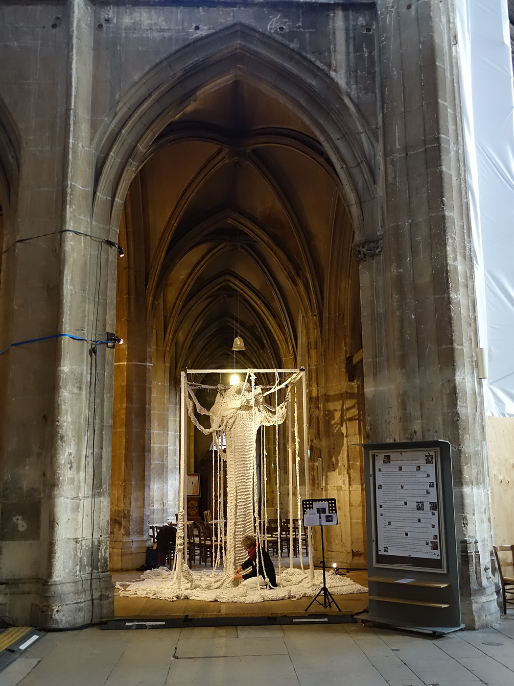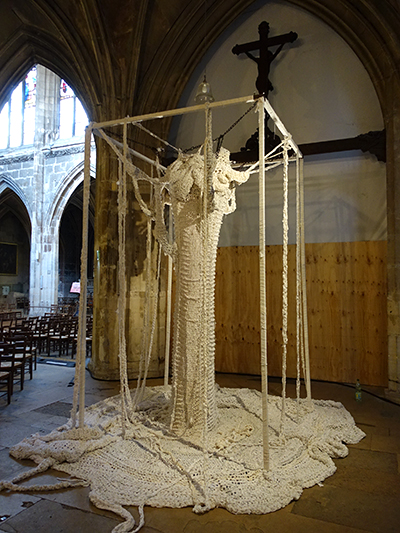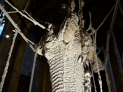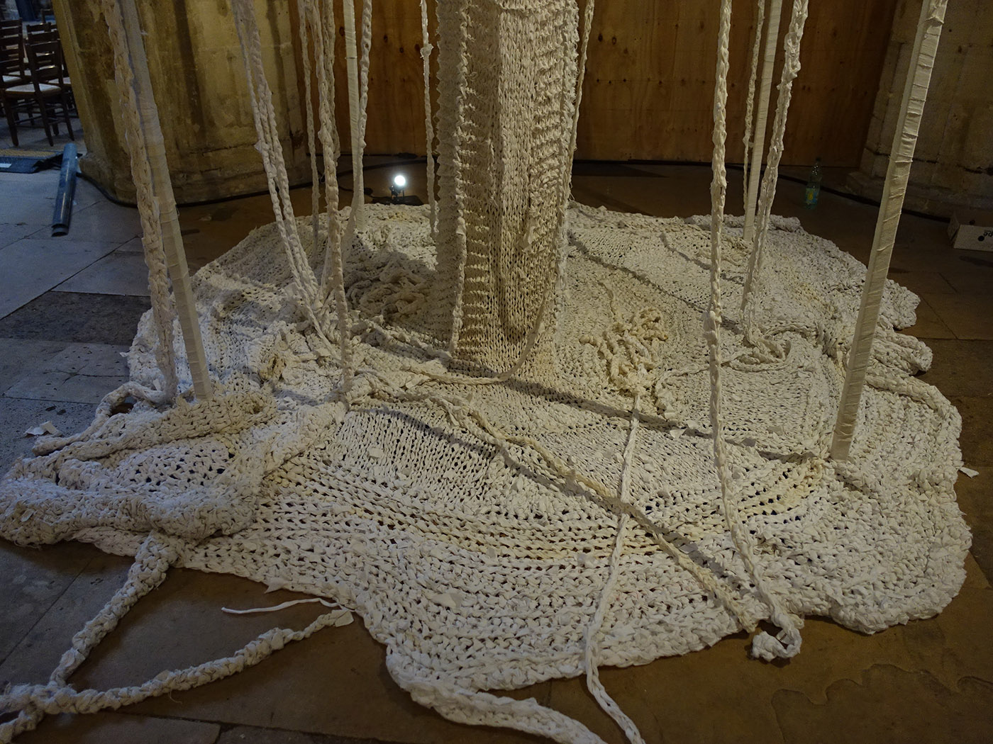 L’arbre ne tient pas que par des tresses, il est aussi porté par les principes-mêmes de son élaboration : c’est une œuvre « in progress » permanent qui continue d’être tissée par l’artiste dans les lieux où cette dernière l’expose. Par des rajouts de draps, l’arbre des murmures vit et grandit tout en se déformant : sa vie se densifie à Saint-Merry avec des broderies ; il s’embellit. Symboliquement racines et traînes de mariée s’entremêlent, pesanteur et puissance de renouvellement se mélangent.