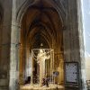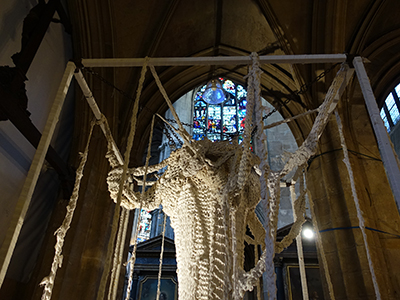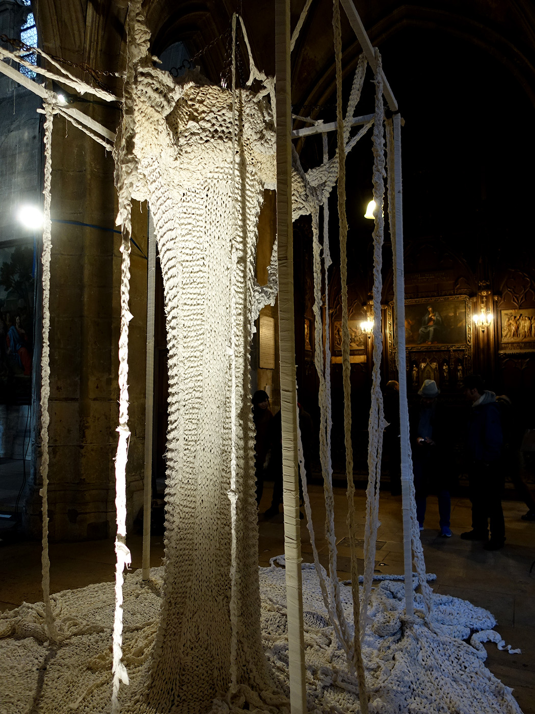 Formellement, l’arbre des murmures, avec sa frondaison, vient se mesurer aux colonnes et à la voûte des bas-côtés, le tissu blanc répondant à la pierre beige. La rigueur de l’architecture sert d’écrin à l’imaginaire d’une sculpture molle. Comme dans une mangrove, les ourlets-racines ont une imposante présence sur les dalles. Ainsi cette composition artistique s’oppose presque terme à terme à son environnement immédiat : dur/mou ; tissu/pierre ; nervure de la voûte/ étalement du tissu. De ce bel ensemble surgit l’inquiétant, probablement du fait de l’approche de l’artiste :