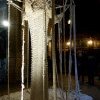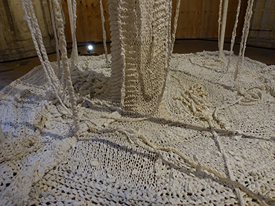 « L’arbre des murmures est né à mon retour de résidence à Taïwan (novembre 2014). Là-bas pousse un arbre vénéré et légendaire surnommé “l’arbre qui marche“. Ne pouvant s’implanter dans le sol, il a développé, pour se soutenir, tout un réseau de branches racinaires. Ainsi muni de ses nombreuses cannes, il se déplace de quelques centimètres par an. Tricoté de draps anciens (déjà plus de 60), pièces d’étoffes intimes, empreintes des stigmates des humeurs corporelles, l’arbre des murmures s’élève à trois mètres cinquante et se répand au sol, cherchant à prendre racine. Il se dresse, prisonnier de ses chaînes, majestueux, immaculé, troublant. Il vibre et nous murmure, secrètement nouées, les affres des ténèbres.