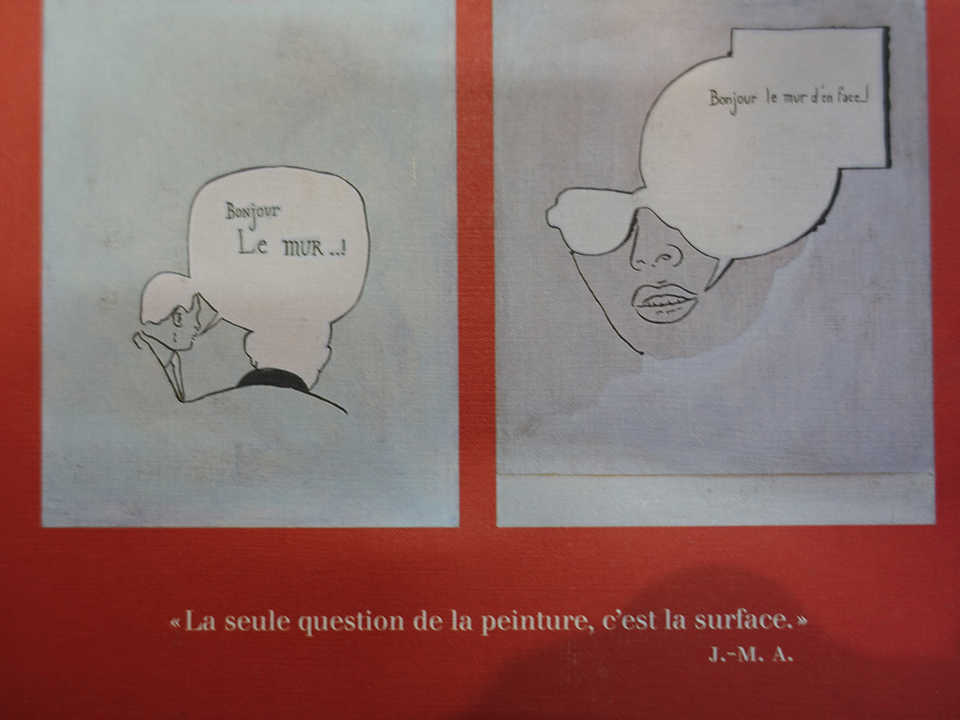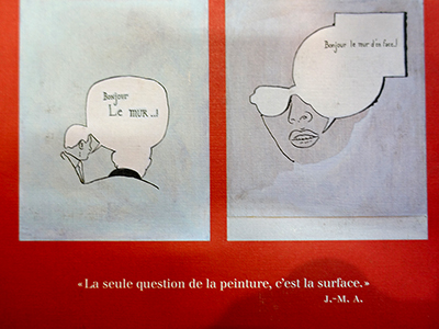 Comment Jean-Michel Alberola conçoit-il son art ? Deux figures peintes se répondent d’un bout à l’autre et reprennent la question sur le pouvoir : « Bonjour le mur »/ « Bonjour le mur d’en face ». Il reste à la surface de la toile, et lui fait jouer un plein rôle, sans la profondeur illusionniste. Deux toiles en dialogue lointain comme le rapport entre l’œuvre de l’artiste et la pensée du visiteur, une question et une invitation silencieuses. Ce n’est pas seulement le regardeur qui fait l’œuvre, comme l’affirmait Marcel Duchamp, mais ici, il est invité à poursuivre dans l’action ou la pensée, s’il le désire. Cet art plaide toujours pour la mise en relation des êtres et pour le collectif. Le plasticien reste un utopiste plein de bienveillance.