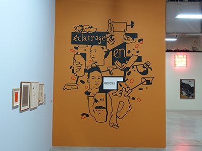 • Dans la dernière salle, une fresque « Eclairage en groupe », invite à la pensée collective et au débat, avant la toile « Passage de la frontière », placée à gauche de la porte de sortie. À l’heure où le terme vivre-ensemble sature les discours, le poète lie le poétique au politique.