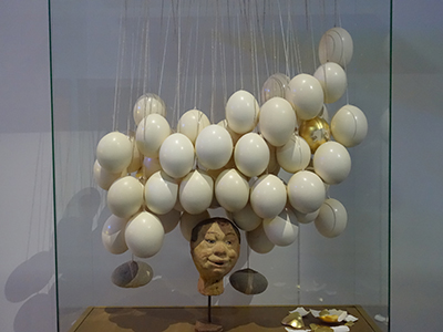 Dès l’installation introductive –une tête en papier mâché surmontée d’œufs d’autruche (choisis pour leur taille, mais aussi pour l’attitude bien connue de l’animal), dont certains sont cassés et laissent entrevoir un intérieur de feuilles d’or– Jean-Michel Alberola présente son parti-pris.