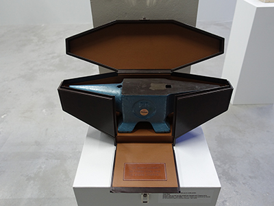 Nombre des œuvres de Jean-Michel Alberola sont des objets critiques et pleins d’humour, au premier degré de la représentation, comme cet étrange étui qui ressemble à un cercueil précieux enfermant une enclume dans laquelle se trouvent deux trous que l’on imagine avoir retenu les manches d’une faucille et d’un marteau. Mais c’est dans le cartel qu’est révélée la prise de distance contenue dans cette œuvre splendide d’un artisan du cuir : elle a été faite par la société de luxe internationale Hermès et le titre ouvrant à sens multiples "Le remplacement du verbe être par le verbe porter" (1990-2006).