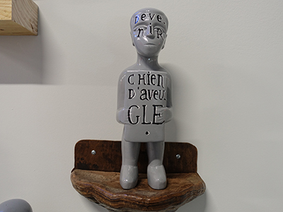 • La posture de l’artiste semble se trouver sur la petite sculpture grise, fétiche inspiré d’une statuette Fang du Gabon « Devenir un chien d’aveugle », l’aveugle étant implicitement tout un chacun et la société.